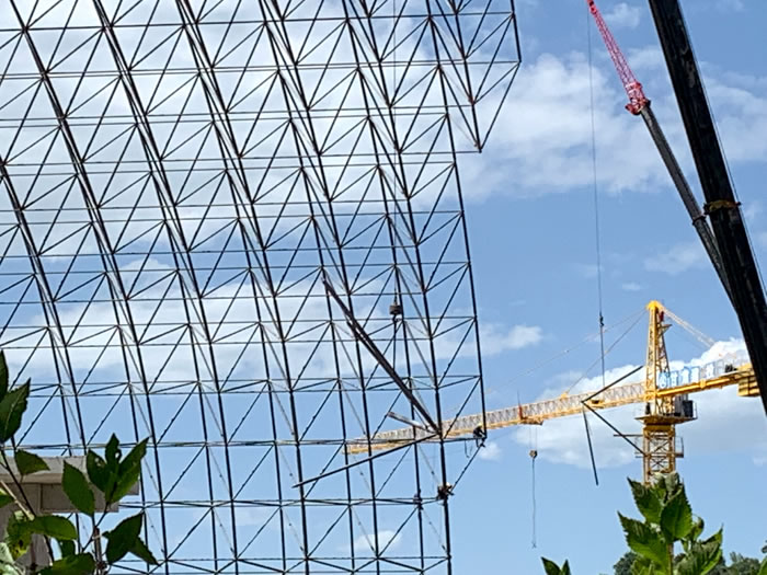 (4)本工程網架采用“山墻起步+錐體高空散裝法”進行安裝,即先安裝1軸山墻網架(含相鄰跨網架)作為整個網架的起步網架,然后從起步網架開始依次往17軸方向對網架進行高空散裝,***后安裝17軸山墻網架,***終安裝完成整個網架。