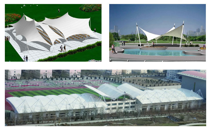 膜結構所用膜材料由基布和涂層兩部分組成.基布主要采用聚酯纖維和玻璃纖維材料;涂層材料主要聚氯乙烯和聚四氟乙烯。常用膜材為聚酯纖維覆聚氯乙烯(PVC)和玻璃纖維覆聚聚四氟乙烯(Teflon)。PVC材料的主要特點是強度低、彈性大、易老化、徐變大、自潔性差,但價格便宜,容易加工制作,色彩豐富,抗折疊性能好。為改善其性能,可在其表面涂一層聚四氟乙烯涂層,提高其抗老化和自潔能力,其壽命可達到15年左右。Teflon材料強度高、彈性模量大、自潔、耐久耐火等性能好,但它價格較貴,不易折疊,對裁剪制作精度要求較高,壽命一般在30年以上,適用于***建筑。
